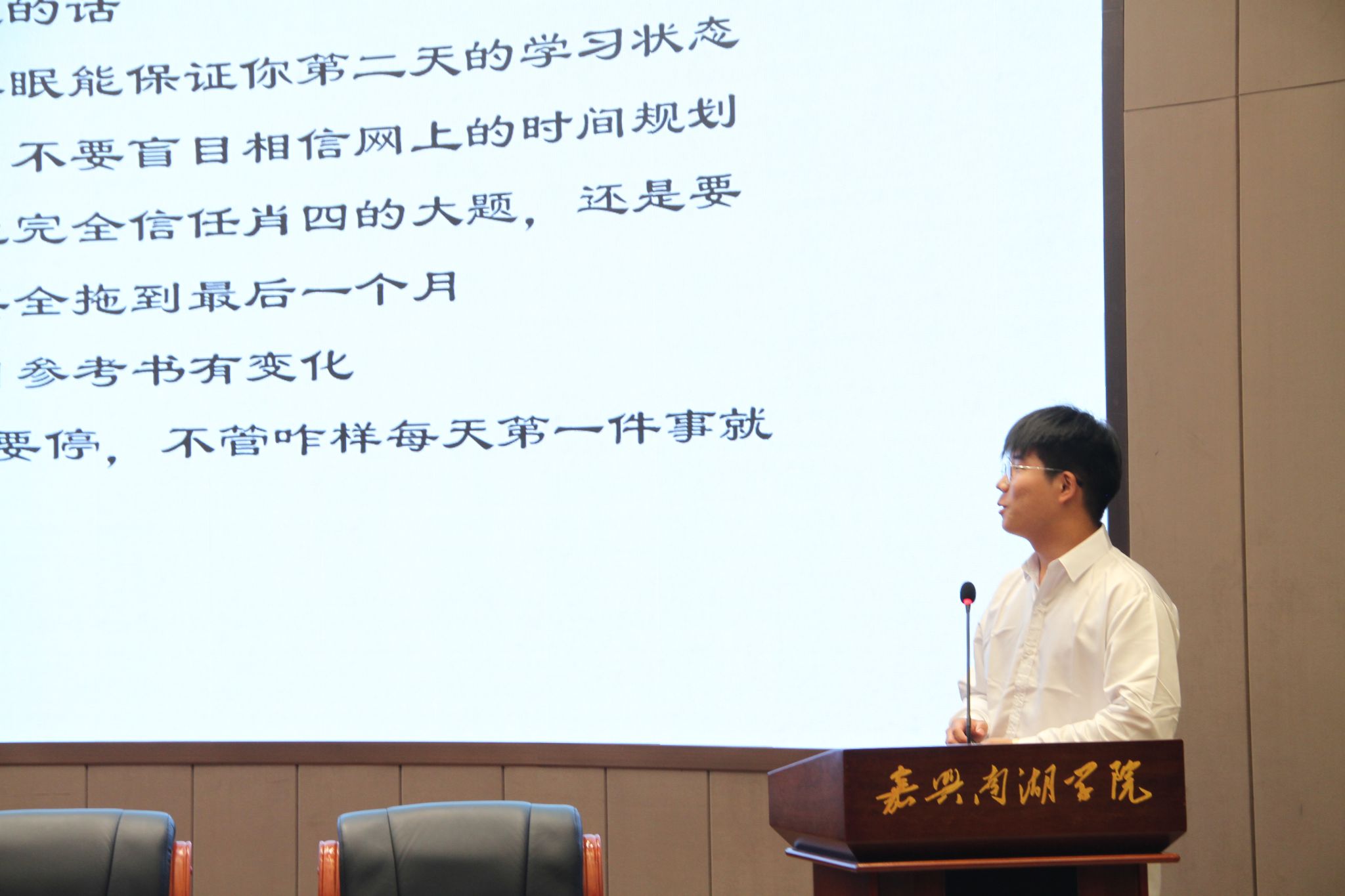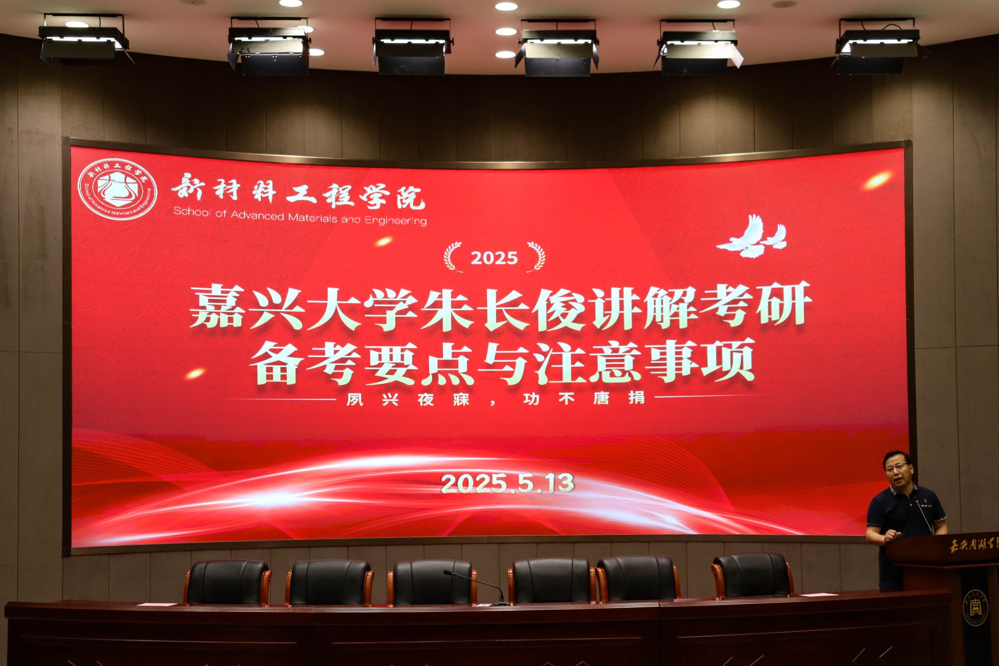 交流环节中,嘉兴大学生化学院副教授朱长俊老师为同学们详细讲解了考研备考要点和注意事项,提供了宝贵的指导。公共基础教研部的教师代表也与考生们进行了深入交流,解答了他们在备考过程中的疑惑。随后,2025届考研上岸学生代表洪朝阳、顾梦杰、张猛、王冰如、章银锋依次分享了各自的备考经验,内容涵盖院校选择、复习方法、心态调整等方面,为2026届学子提供了切实可行的建议。