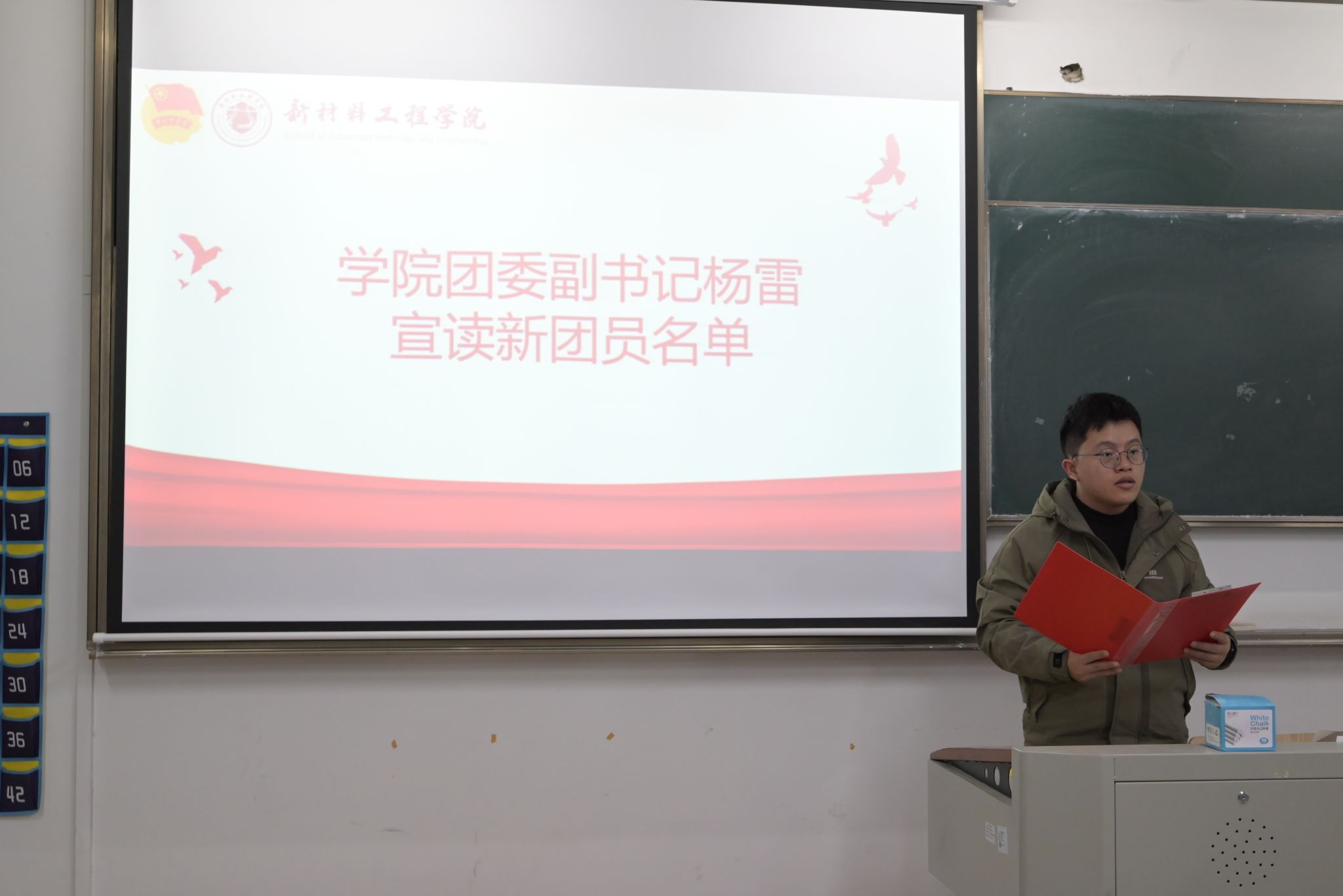 学院团委书记邵佳向全体新团员表示祝贺并提出殷切期望。她强调,成为一名共青团员意味着更高的要求和更重的责任,希望大家坚定理想信念、加强理论学习、锤炼品德修为,在学习和工作中走在前列、干在实处,努力成长为有理想、敢担当、能吃苦、肯奋斗的新时代好青年。她特别强调,青年阶段是价值观形成的关键期,希望新团员们从入团这一刻起,就把“廉洁”二字铭刻于心,明辨是非、恪守正道,自觉抵制不良风气,做到心有所畏、言有所戒、行有所止。要以入团为起点,系好人生的第一粒扣子,始终保持清澈纯粹的政治本色,在青春的赛道上跑出不负时代、不负韶华的最好成绩。