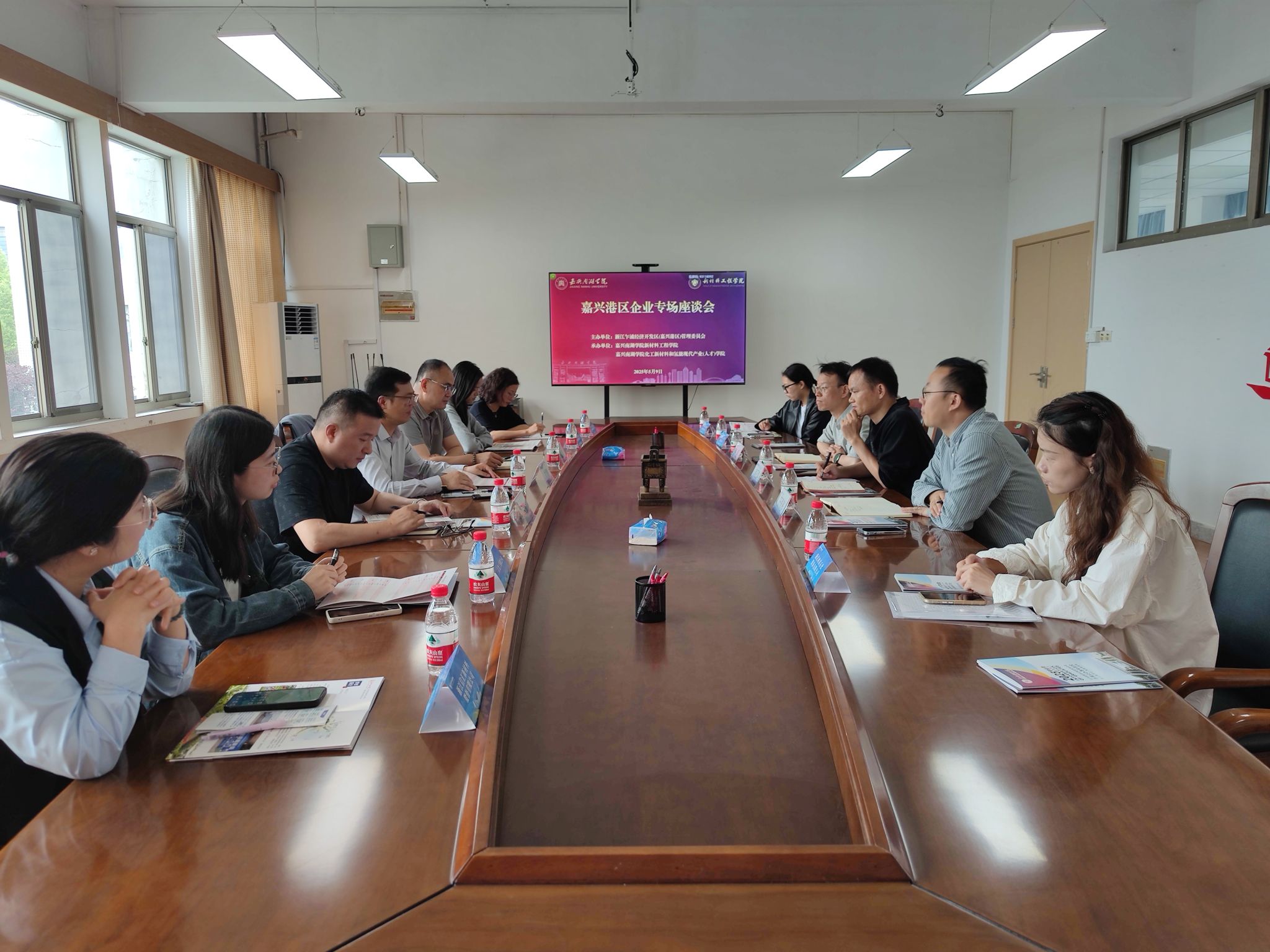 座谈会上,赵正喜副书记介绍了学院在材料科学与工程领域的学科优势及人才培养成果,强调学院始终以服务地方产业为导向。刘耀副部长则从港区新材料产业集群的发展规划出发,提出“引才留才”的迫切需求,期待通过校企联动实现人才链与产业链深度融合。与会企业代表围绕技术研发、岗位需求、实习实践等议题展开交流,浙江惠禾源环境科技、信汇新材料等企业现场表达了联合培养定制化人才的意向。