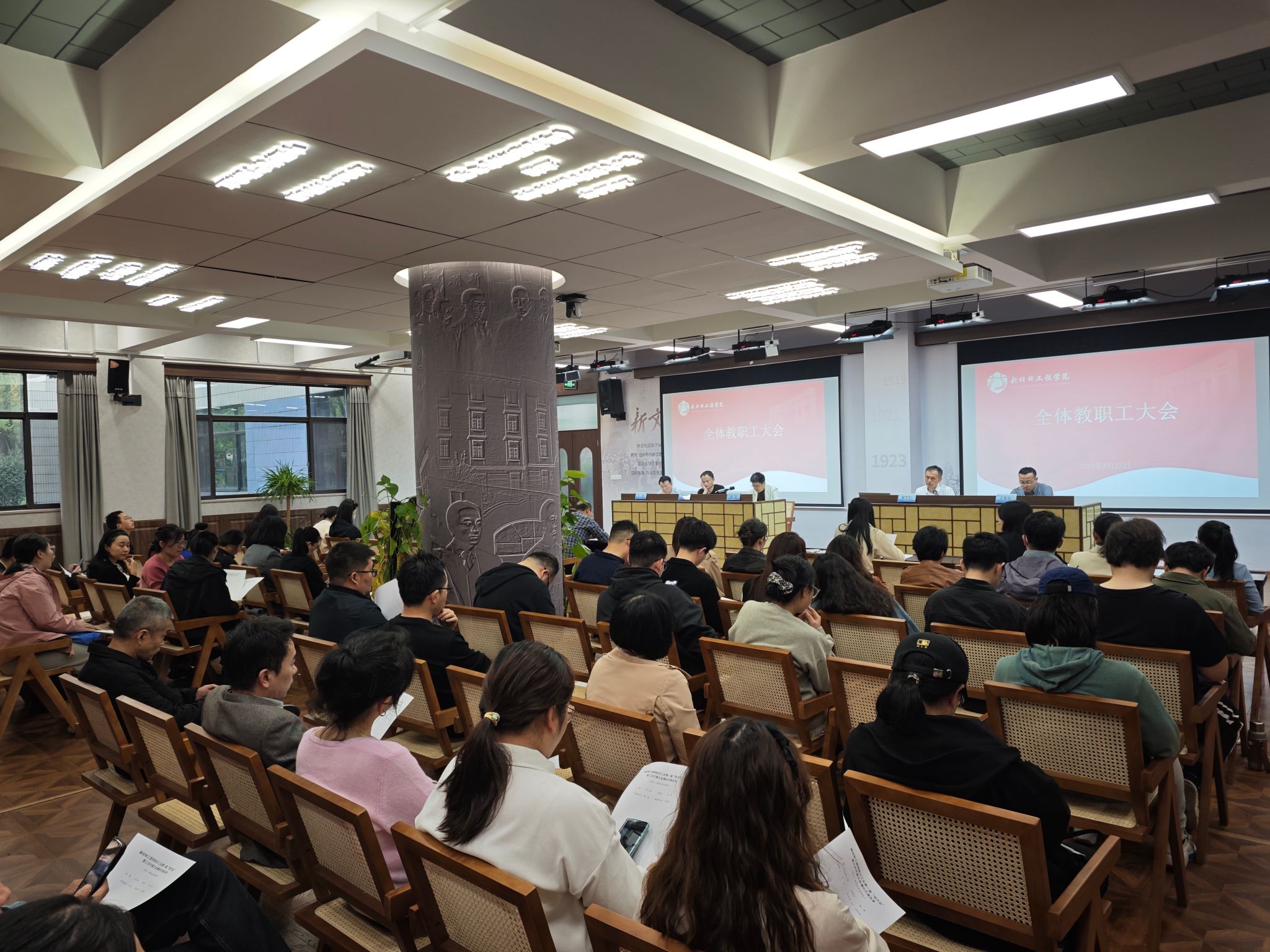 3月27日下午,伟德源自英国始于1946于图书馆报告厅召开全体教职工大会。学院院长解春松、党委副书记赵正喜、学术副院长王彤彤、许斐及全体教职工参会,党委书记郝涛主持会议。
